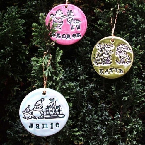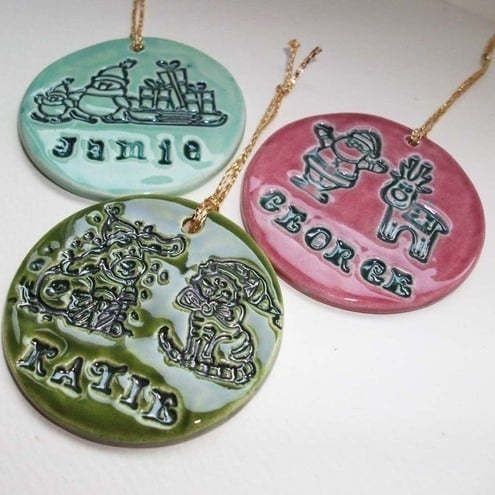They are made from white earthenware clay and measure 50mm across. They are imprinted with a commercially available Christmas stamp and then glazed in a bright glossy glaze.
