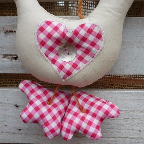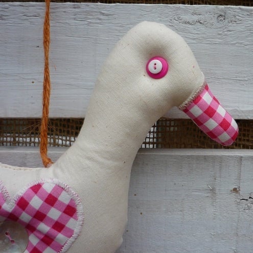I have made her from natural calico with appliqué hearts and beak made from Tanya Whelan pink gingham. She has padded webbed feet and mother of pearl button details, she hangs from jute twine..