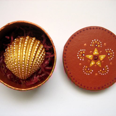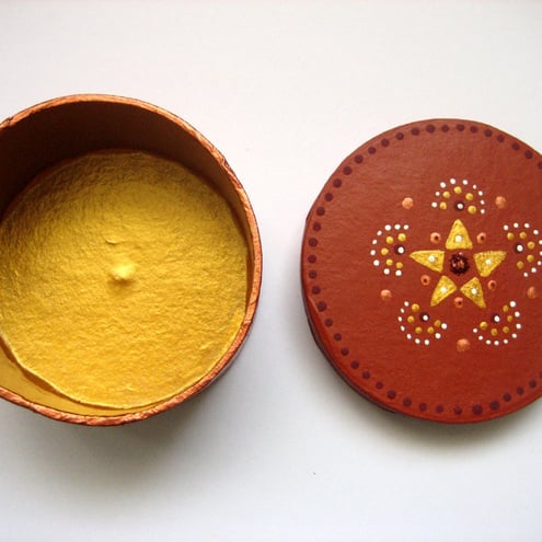 This is a loving hand painted papier mache gift box with a star design. It measures 3 inches diameter and is 2 inches deep.