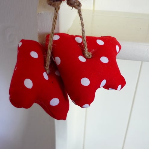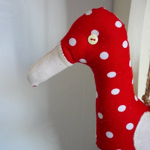 I have made her from natural calico on one side with appliqué hearts and beak made fro red spotty fabric, fabrics are reversed on the other side. She has padded webbed feet and spotty buttondetails, she hangs from jute twine..