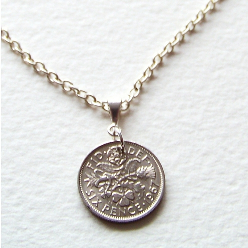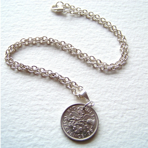 A Genuine Old Sixpence hanging from a Silver plated chain with a lobster clasp fastener.