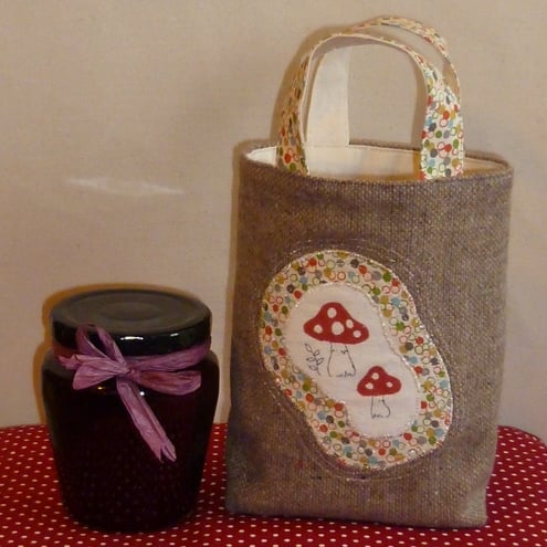 (The jar of damson jam in the photographs is 9.5cm high and 8cm in diameter and fits onto the bag beautifully. The jam is not included in the sale. It was made by my mum and belongs in my tummy!)