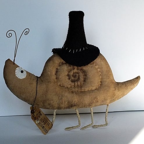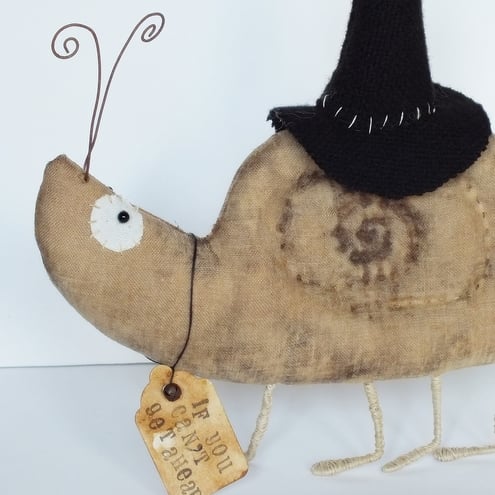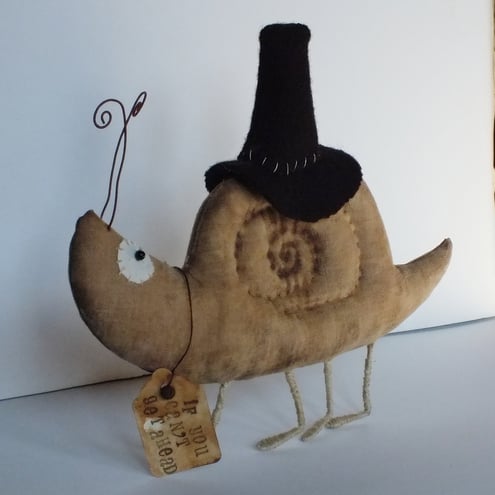 I was actually told by Kirsten of Quernus crafts and in no uncertain terms, to make a snail, so - Snail is made from coffee dyed linen which has been sanded to give a ' I've been around the block a few times, albeit very slowly ' kind of look.His/her eyes are undyed linen with a black glass bead pupil,the antenna are rusty wire. The hat is made from pure wool coat fabric (a remnant) and is attached permanently to the shell).The shell part has been needle sculpted for definition. The legs ,which i decided every snail needs, are made from linen thread (vintage and Irish) wrapped around shaped wire and then stitched onto the body.
