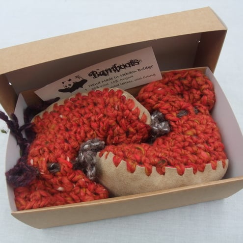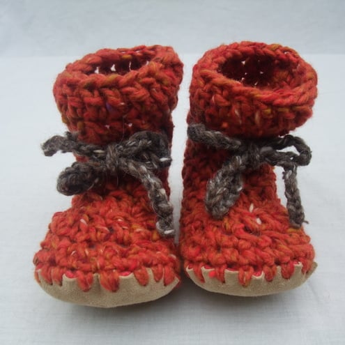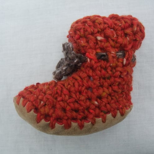 These funky little shoes will keep your baby's feet snug and warm and add a dash of colour to any outfit! Soft chunky wool and angora fabric with stretch for comfort and growing room. A perfect gift for a baby boy or girl.