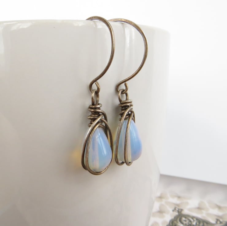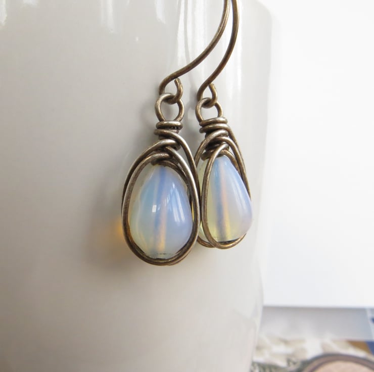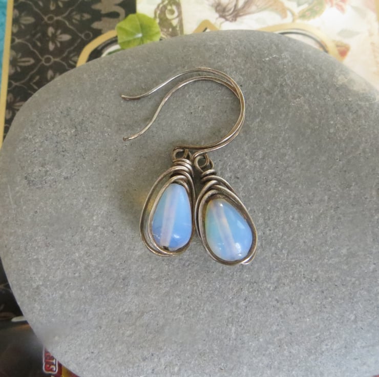 These elegant opalite earrings feature teardrop opalite beads which have been framed with sterling silver wire, and hung from handmade sterling ear wires. They have been oxidised to give a dark antique finish which shows off the subtle colours within the opalite beads perfectly.