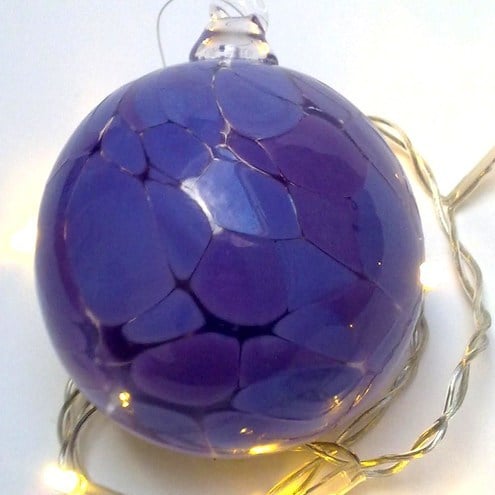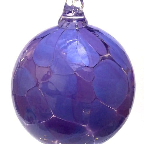 An opaque lavender coloured spotty glass bauble.