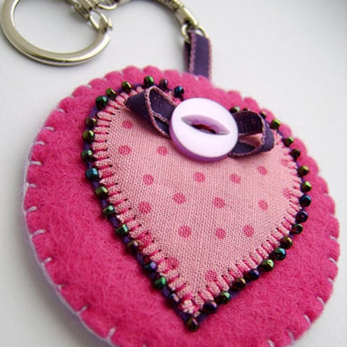 This is a pretty pink felt key ring with pink spot appliqued heart. Beautifully edged with beads and finished with button and ribbon detail. It is backed with lilac felt and has a metal key ring attached.