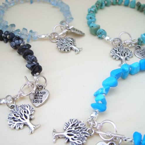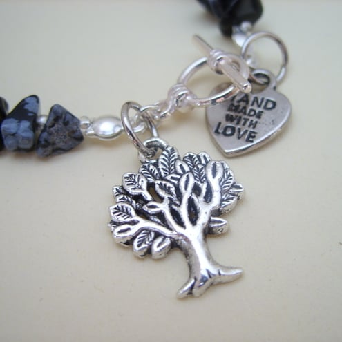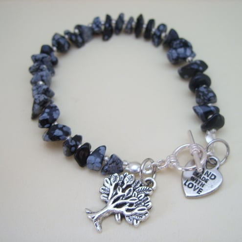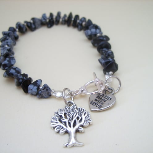 Beautiful natural snowflake gemstone chip bracelet with tree charm and toggle fasten. All my bracelets are approximately 7 inches (standard size), please contact me if you require a custom size.