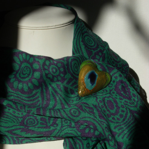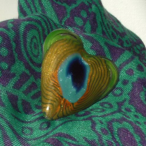 Polymer clay heart pin with mica rich peacock feather cane slice on a pearlescent green background. This pin is great for the colder weather as it will keep your scarf or shawl in place in the windiest weather.