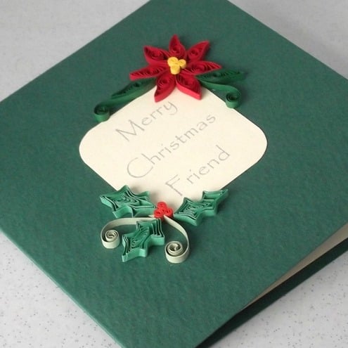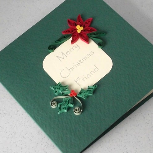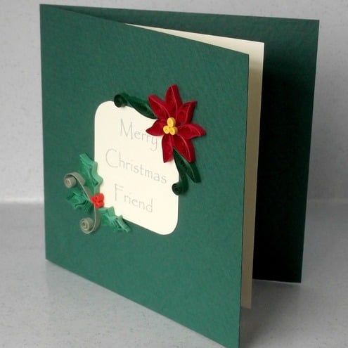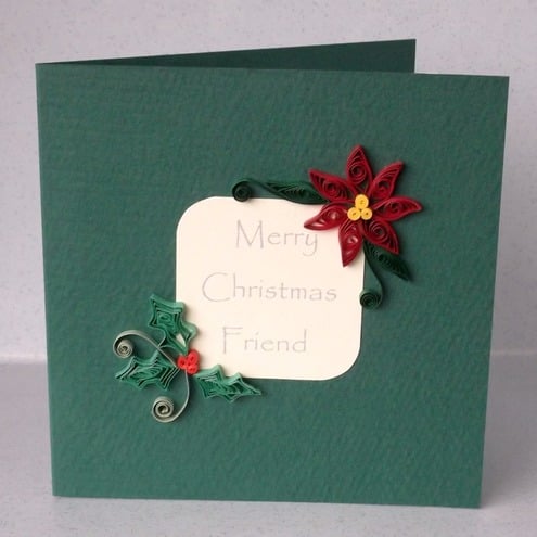 A very pretty quilled Christmas card – a green, textured base card featuring a cream panel which has been printed with the message "Merry Christmas Friend". The panel is decorated with quilled Christmas flowers and foliage.