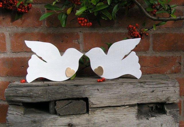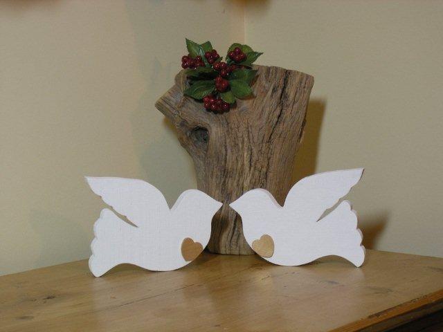 These doves are made out of reclaimed wood and then painted white with a water based paint. A small gold painted heart has been attached.