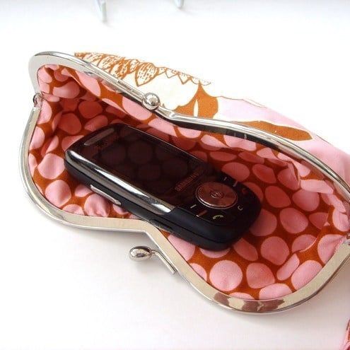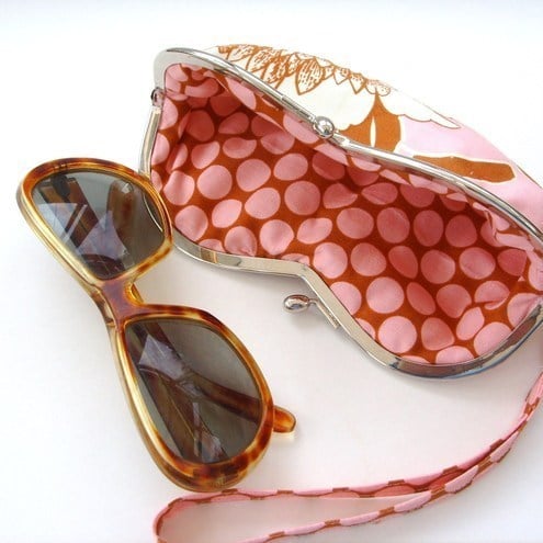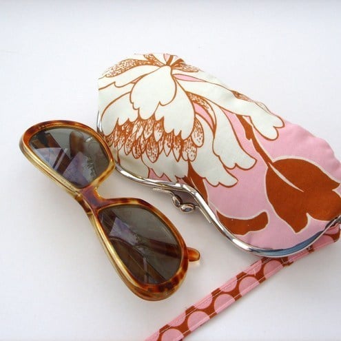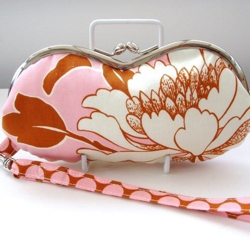 Charming little wristlet purse for sunglasses or mobile phone in pretty Amy Butler tree peony fabric with contrasting spotty lining and removable wrist strap. Measures approx 7"x3.5"