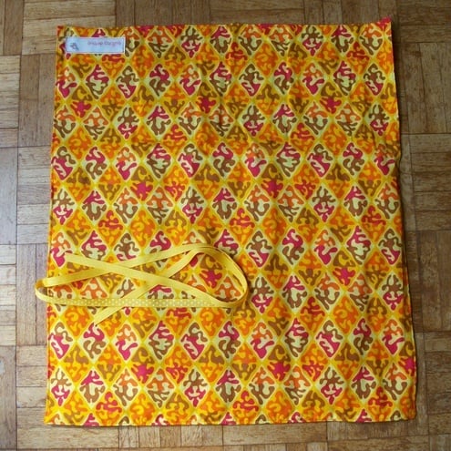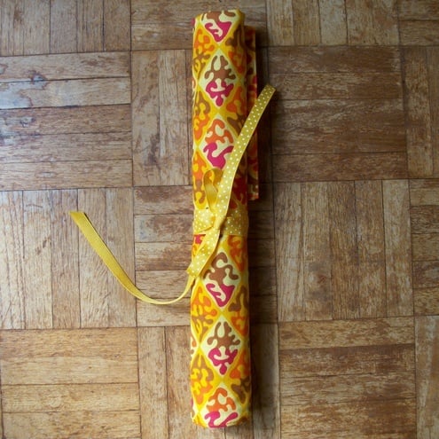 The top of the case is a flap which folds over to keep the needles safe. Once rolled up, there is a yellow spotty ribbon tie to secure the holder. It is top stitched to achieve a professional finish. Total size when placed out flat is 17.5" x 19".