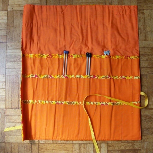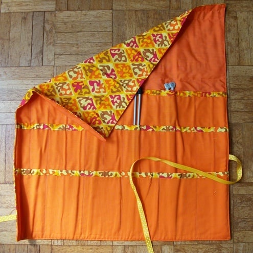 I have used this funky 1970's fabric to create this useful knitting needle case. It is lined with a plain orange cotton fabric.