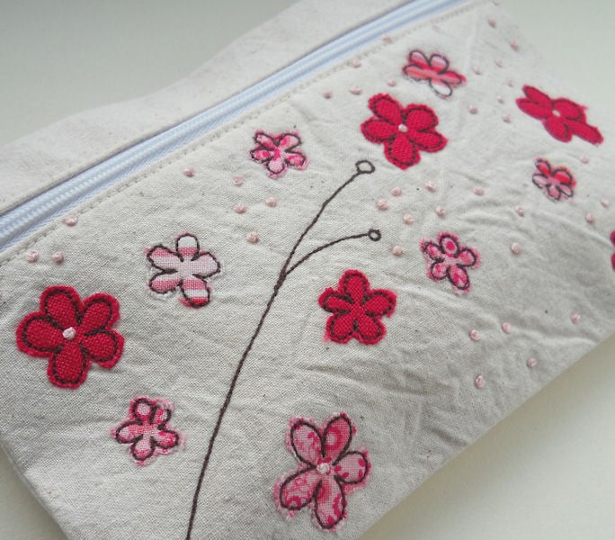 the cherry blossom is in pink printed cottons and pink linen. the fabrics are appliqued onto pre-washed calico, and the details drawn on with free machine embroidery. pale pink french knots dot the centre of flowers and the front of the purse.
