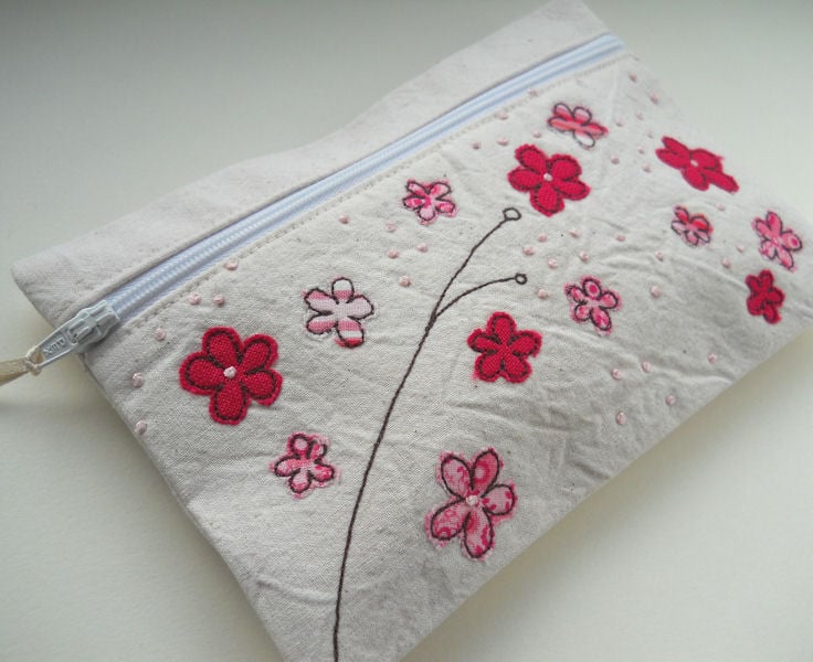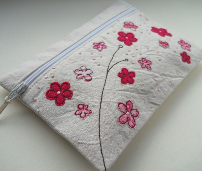 this generously sized zip purse features pink appliqued and hand embroidered cherry blossom.