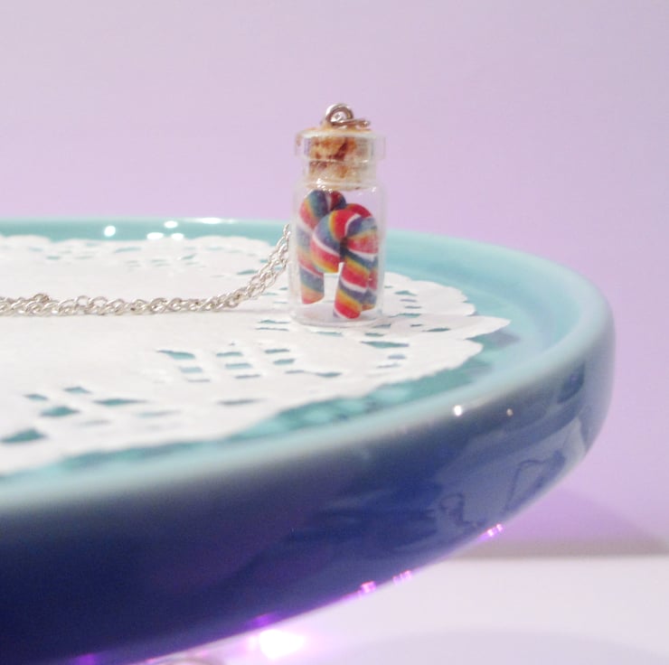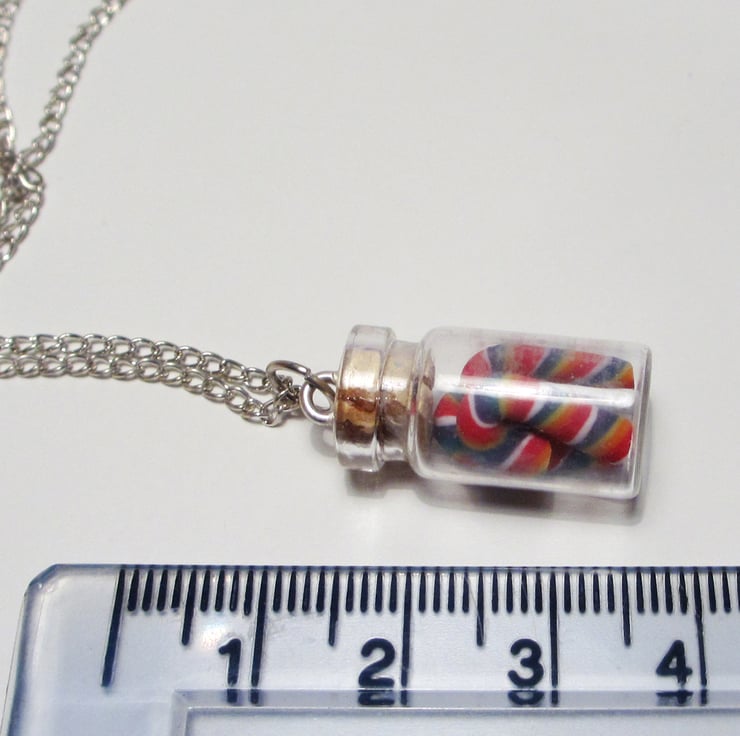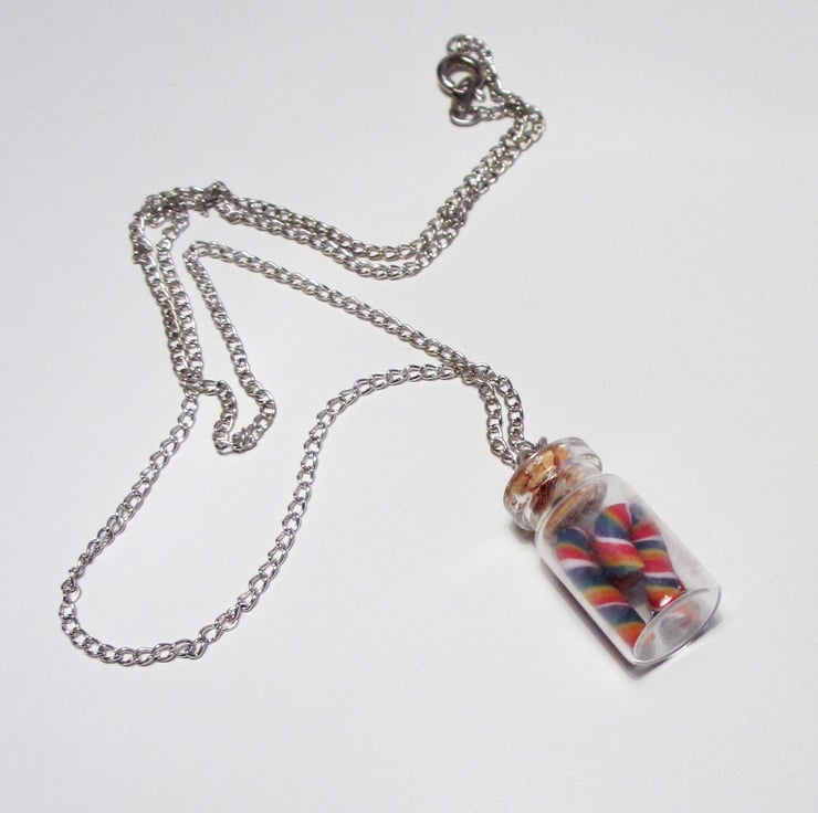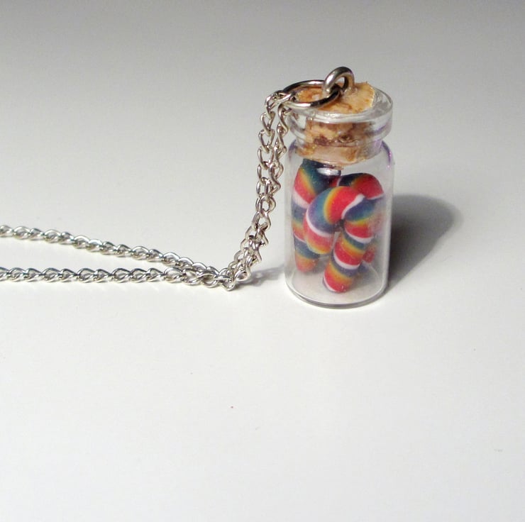 The candy canes are made of Fimo modelling clay, while the jar is glass with a stopper in the top (this is sometimes cork, sometimes plastic)! Threaded onto a silver plated necklace chain.