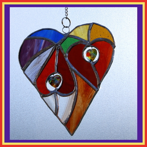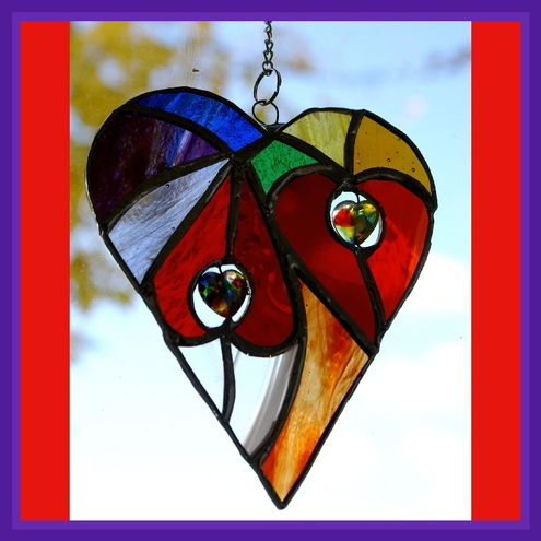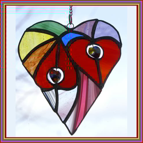 It is a big heart containing 2 smaller, bright red hearts and these are surrounded by different shades of glass in all the colours of the rainbow. I have also used some very pretty streaky 'blood red' and pale pink streaky glass at the bottom of the heart for added effect. Inside each of the two smaller hearts is a gorgeous multi-colour heart bead.