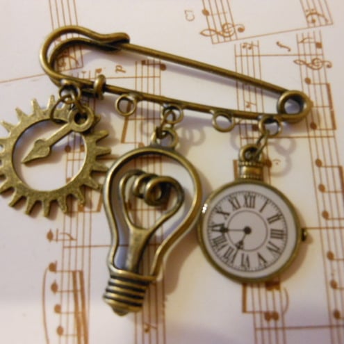 This is a lovely bronze brooch pin it has a watch cog with a brass watch with a light bulb all attached on a bronze kilt pin measures 5cm.