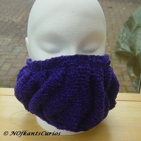 An over large inner band of the chenille yarn was then knitted and securely sewn into place, so that it pads out the pleated section and allows it to sit warmly and snuggly against then neck.