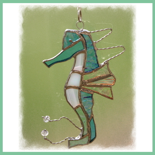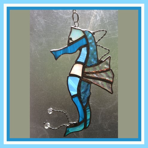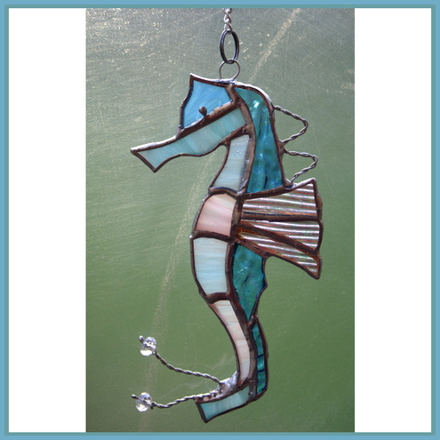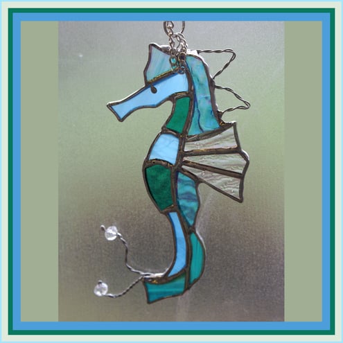 This is a seahorse in lovely shades and textures of turquoise glass. I have used iridescent for the back to give it extra shine and it has 2 very pretty crystal beads on the end of its wire tail and twisted wire decoration on its back. The back fin is clear, corded iridescent glass.