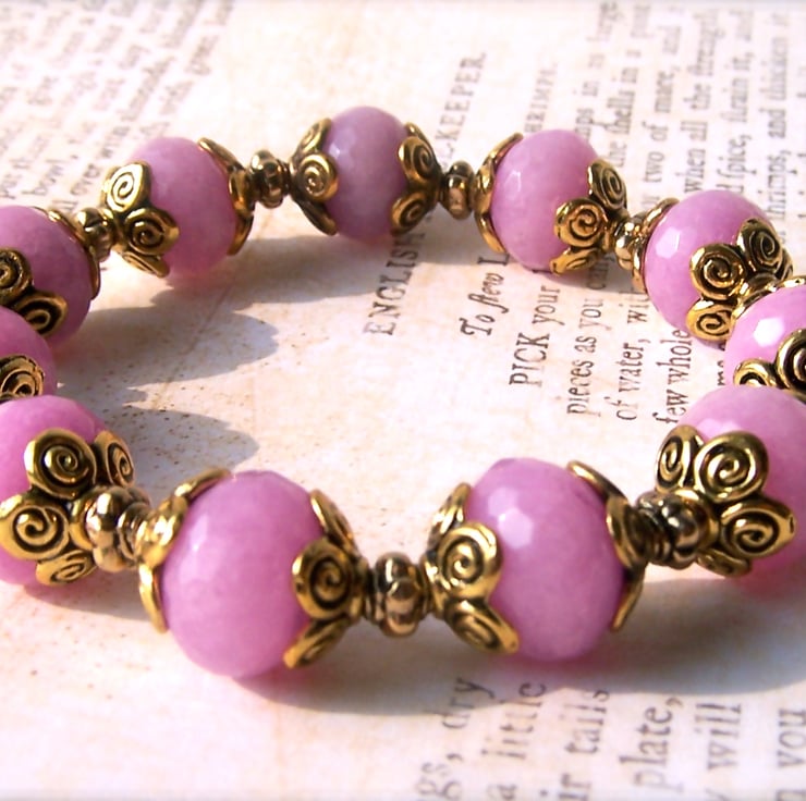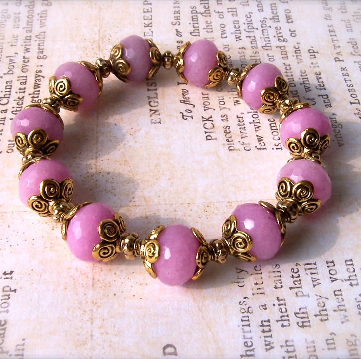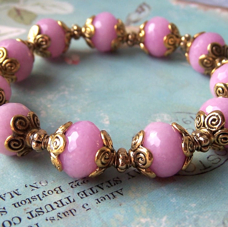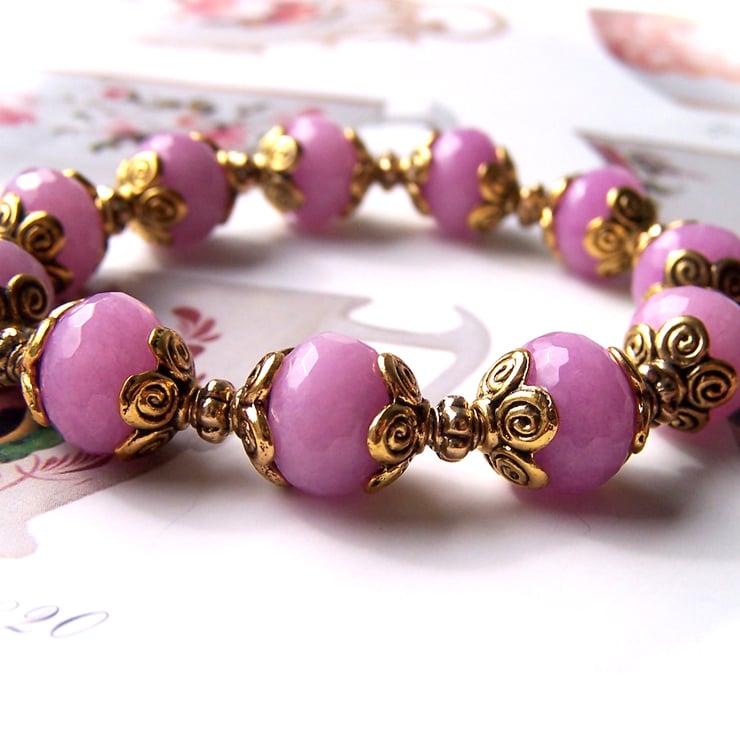 The feature beads in the bracelet are eleven lovely faceted dyed jade gemstone rondelles which are a lovely pinky-lilac colour.