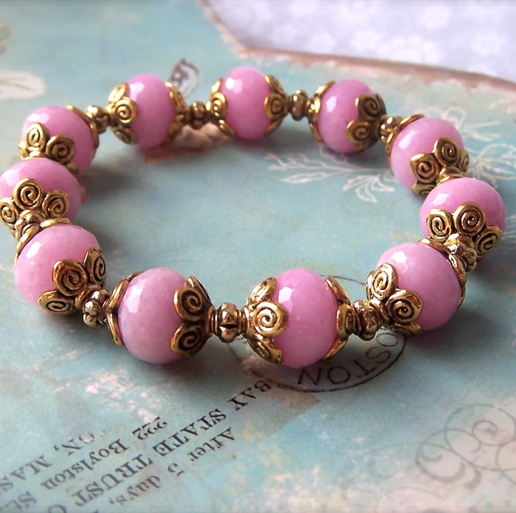 This beautiful and delicate little bracelet in pink and gold features semi-precious jade stones and pretty gold coloured accents. It has lovely movement and is really easy to wear, and would look amazing with a party dress or a blouse.