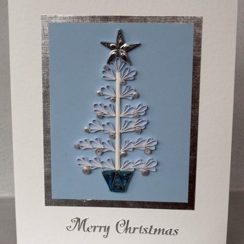A delicate quilled Christmas tree, in shades of white, pale blue and silver mounted on a silver panel.