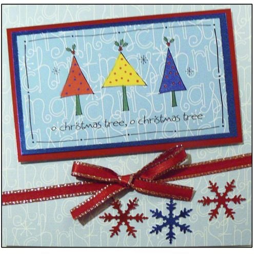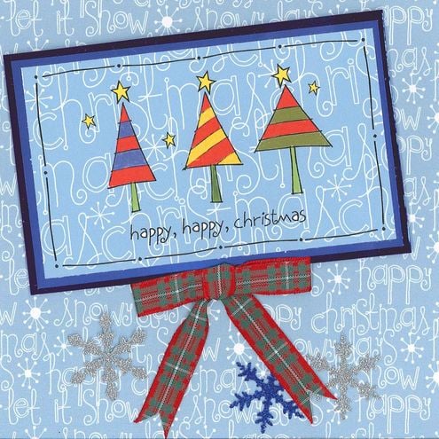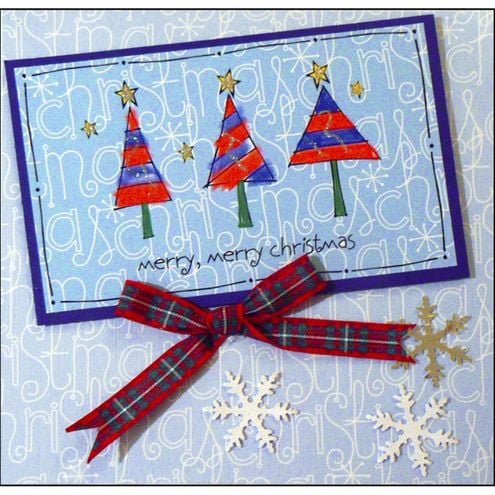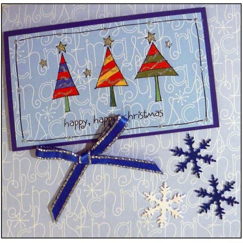 Brightly coloured stripey Christmas trees layered onto royal blue mirri mat and raise-mounted onto 5.75" square card blank, which is decorated with ribbon and snowflakes.
