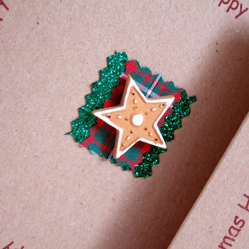 The main design is a clay gingerbread themed embellishment - iether a heart, star, man, tree. This is placed on a square mount of glitter fabric and swatch of ribbon.