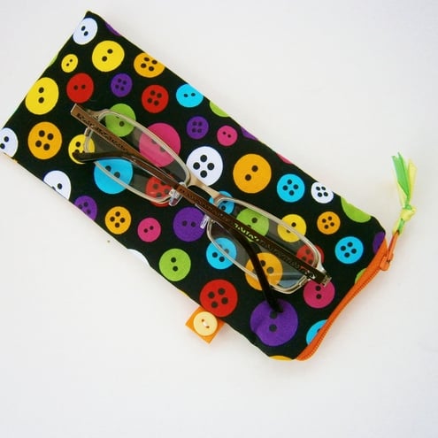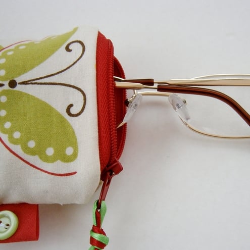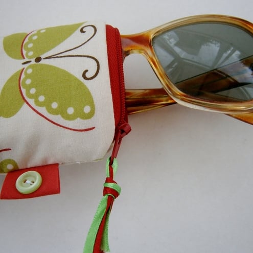 Cute little butterflies glasses case with contrasting zip, ribbon and lining. Padded to protect your glasses