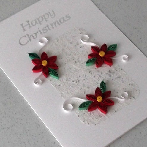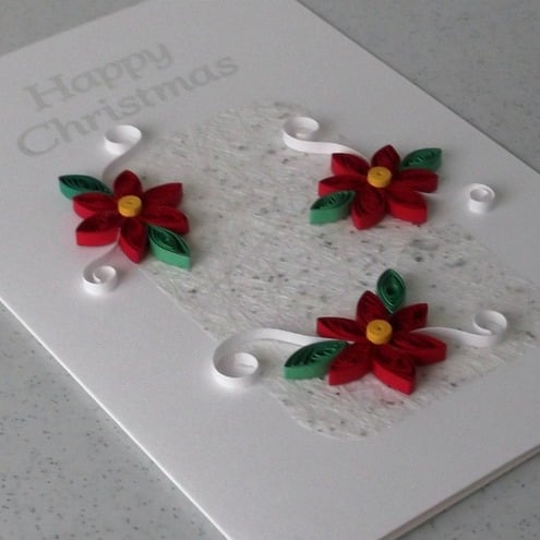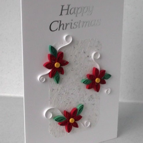 This pretty quilled Christmas card is sure to be appreciated by the recipient. All the quilling is handmade. I handroll each petal, leaf and shape from strips of coloured paper. The result is a beautiful original Christmas card which makes a great keepsake for the future - you will not find anything similar for sale elsewhere.