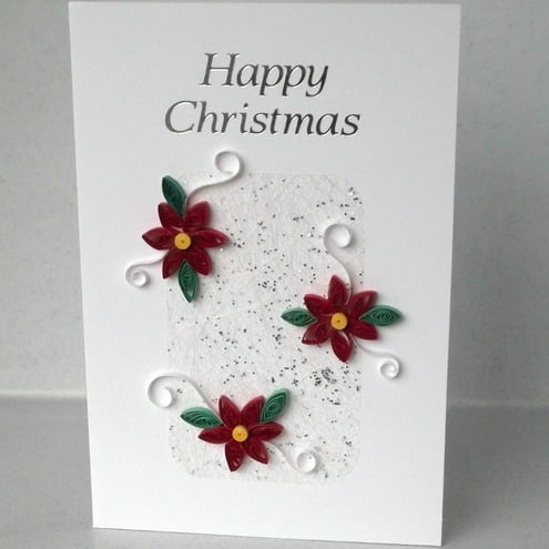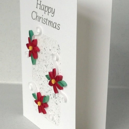 A beautiful quilled Christmas card with a message in silver foil reading "Happy Christmas". Three quilling flowers adorn a panel of sparkly handmade paper, making this card extra special. An original, distinctive handmade greetings card to celebrate a the holiday season.