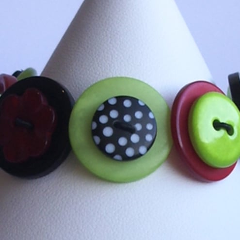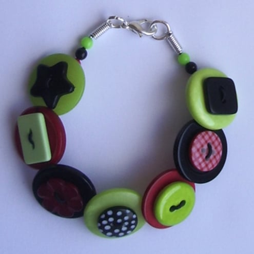 This distinctive button bracelet is rich with an assortment of red, black and lime buttons. These are threaded onto jewellery wire, which secures at the end with a silver plated lobster clasp fastener.