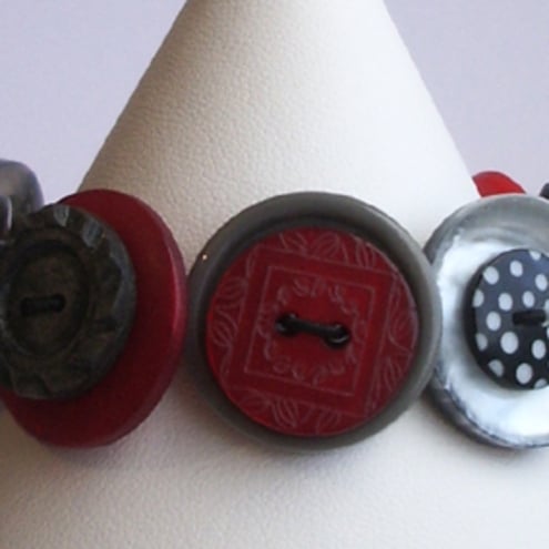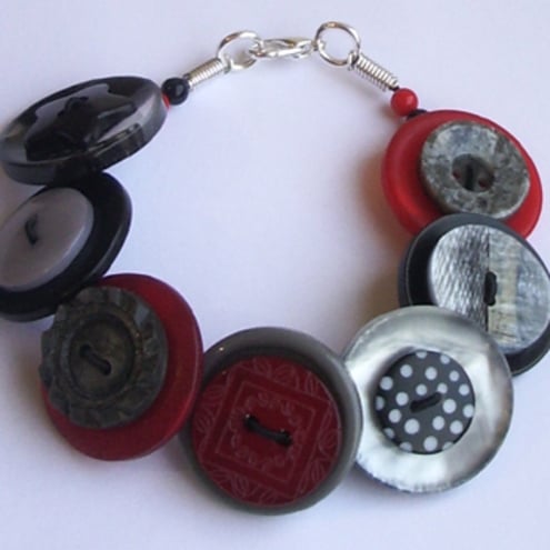 This distinctive button bracelet is rich with an assortment of red, black, grey and silvery buttons. These are threaded onto jewellery wire, which secures at the end with a silver plated lobster clasp fastener.