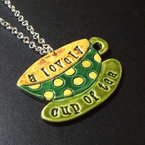 A nice cup of tea pendant is made from white eartheware clay and decorated in purple and green glazes.