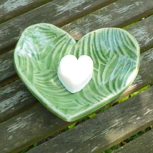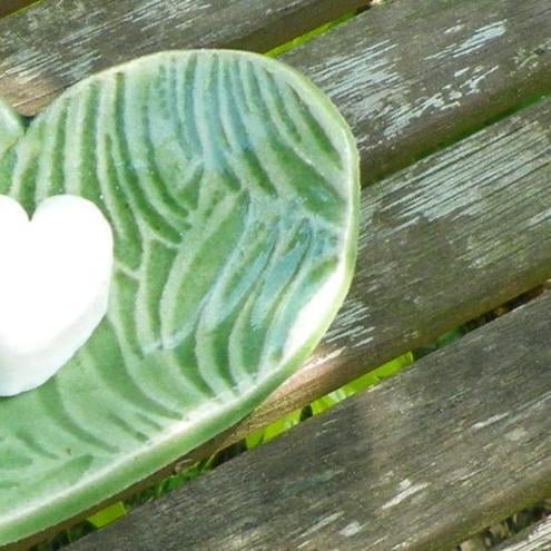 This heart shaped dish was made with a rolled out slab of strong white stoneware clay which I have embossed with a leafy texture.