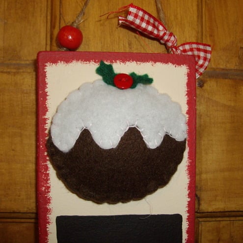 This wooden plaque has been hand painted, the Christmas pudding is hand stiched.