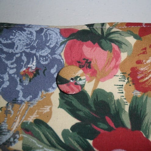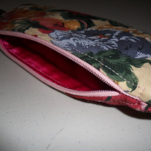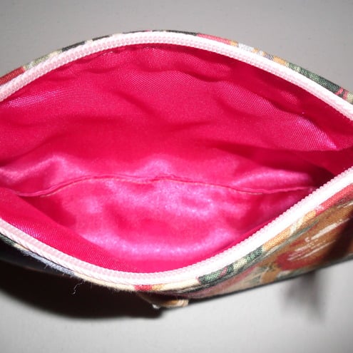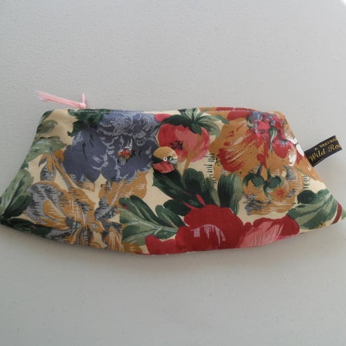 Made in a floral cotton print, this handbag sized make-up purse is big enough tol hold those everyday essentials. It is lined in pink satin and has a pale pink zip.