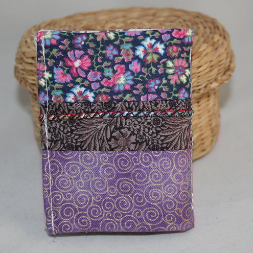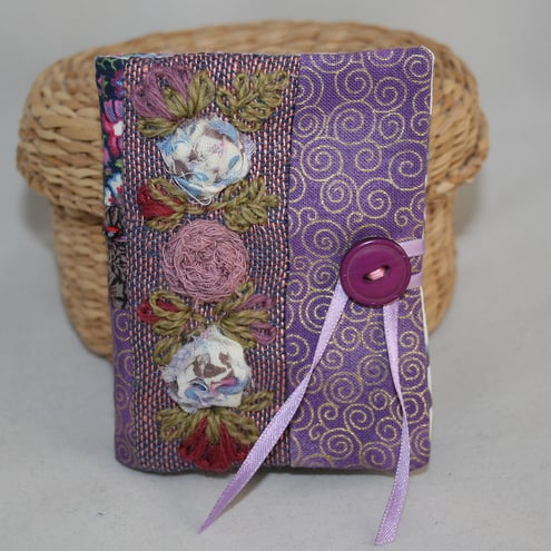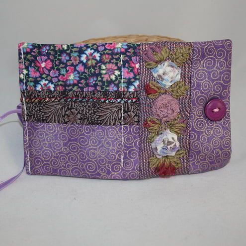 Roses in shades of pink, purple and cream have been embroidered onto a panel on the front cover of this pretty patchwork needle book.