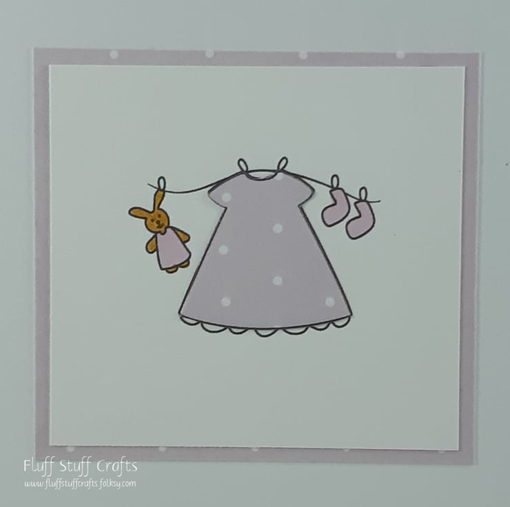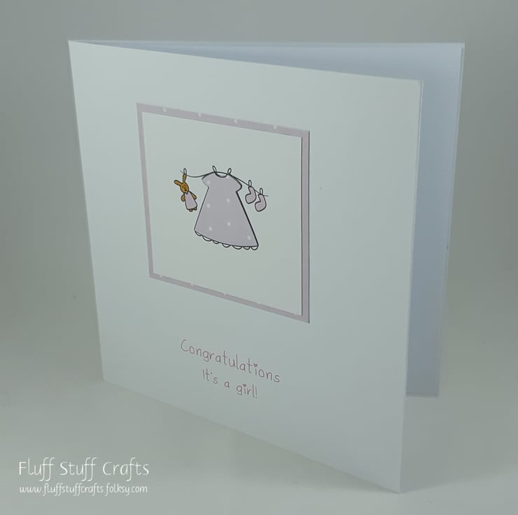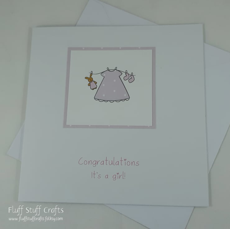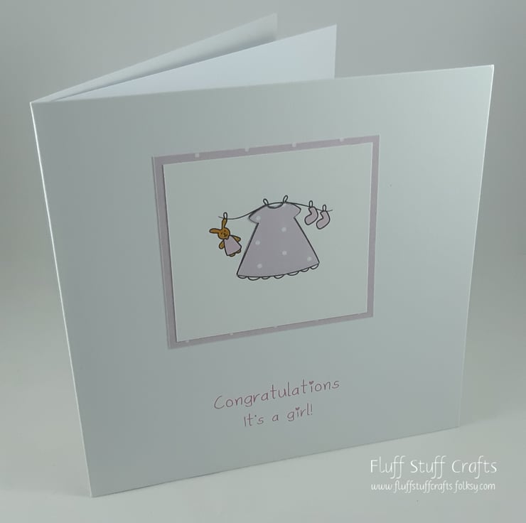 Square white card with cute baby washing line items paper pieced to match pink polka dot border . The printed sentiment reads: "Congratulations it's a girl!".