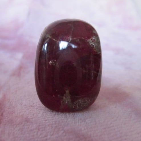 This glass cabochon was fused by me. It has red droplets with tiny pale gold bubbles on an opaque red base. It is approximately 1 inch high and 3/4 inch across. I have 2 of these for sale and as they are individually hand made your one may differ slightly from the photograph.