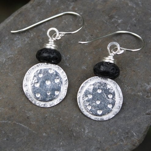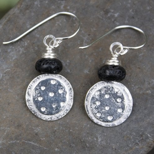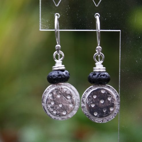 Fused silver discs are punched with a random dotty pattern, and topped with plump gnarly lava stone roundel beads.