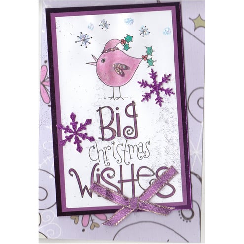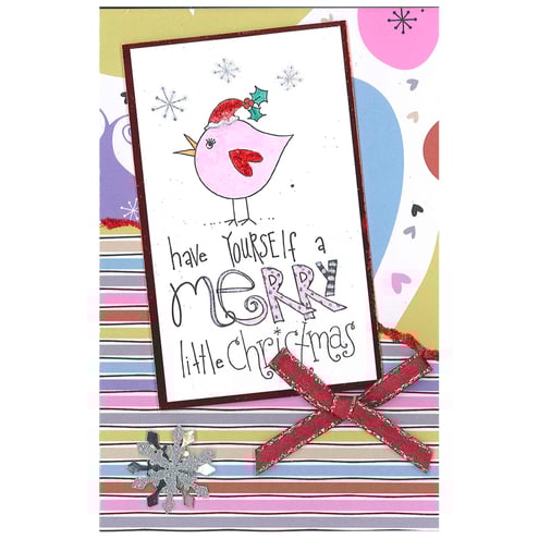 Card is decorated with ribbons, snowflakes and glitter.