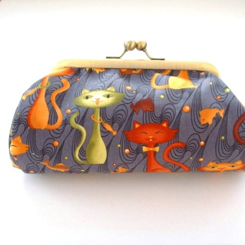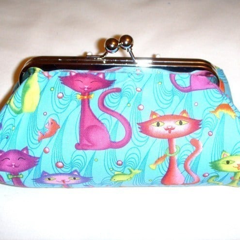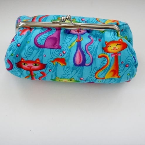Perfect little clutch for your mobile phone, keys, sunglasses,change and credit cards or even a make-up bag. Pretty turquoise fabric with colourful cats and contrasting lining, padding and metal frame clasp.