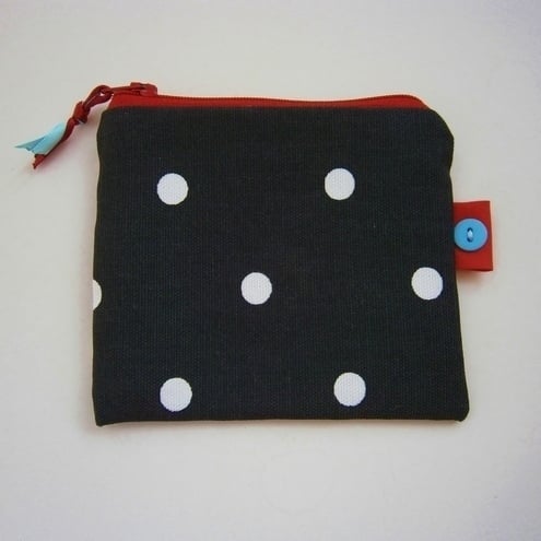 Black spotty printed fabric coin purse, perfect for your coins, notes and cards.