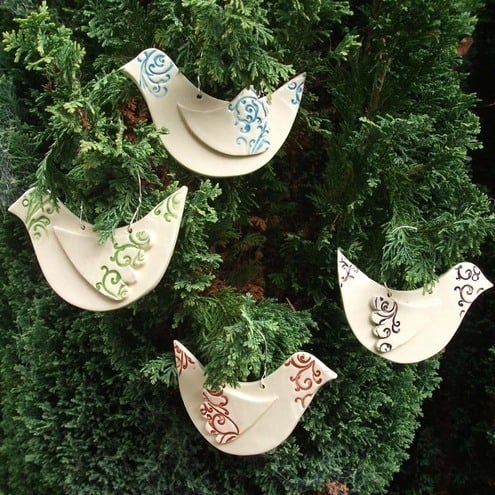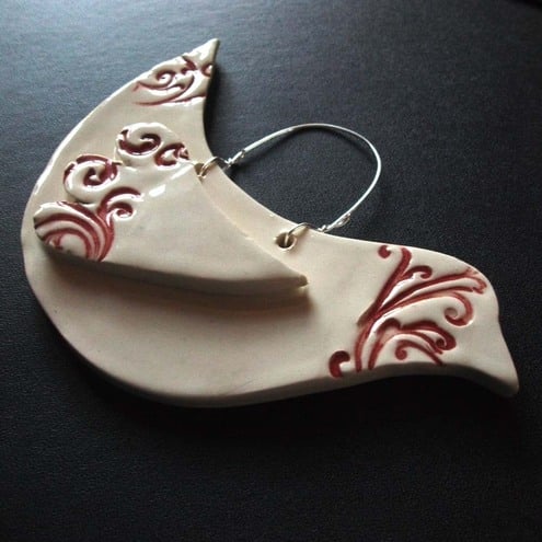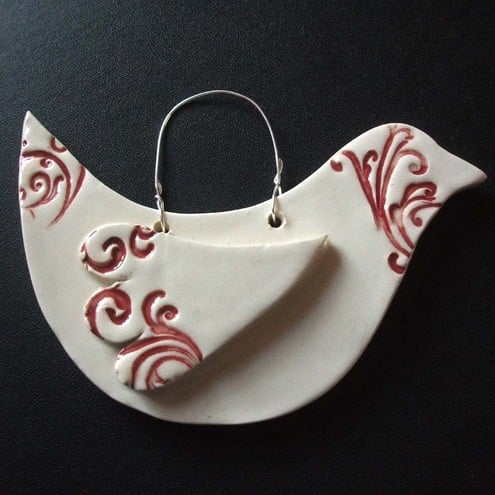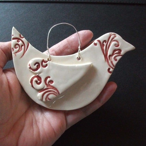 This simply elegant bird decoration is hand cut from white earthenware clay and decorated with an embossed swirl. It is then twice fired to a top temperature of 1100 degrees so it is nice and strong.