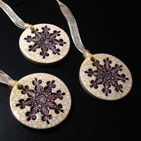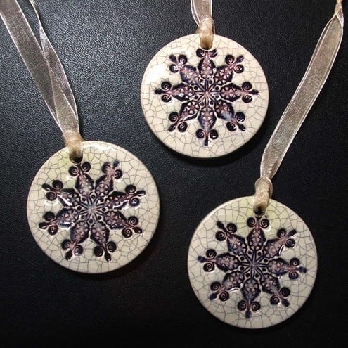 This set of 3 crackled snowflake decorations are made from white earthenware clay and twice fired to a top temperature of 1100 degrees so are nice and strong.