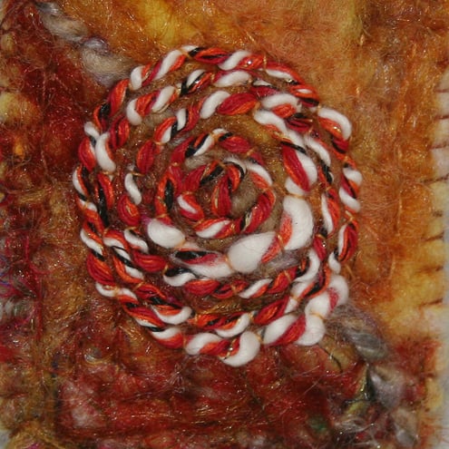 Merino, and other wools, combined with mohair and silk fibres, have been needle felted to create the background for this brooch. Several layers of differing and contrastting shades, have been built up on a base of a pure wool suiting, giving a depth of colour to the design. A diagonal division marked by couching over a hand dyed silk and wool yarn marks the boundary between an area of gold and one dominated by reds. The pinwheel motif has been couched over a slubbed yarn.