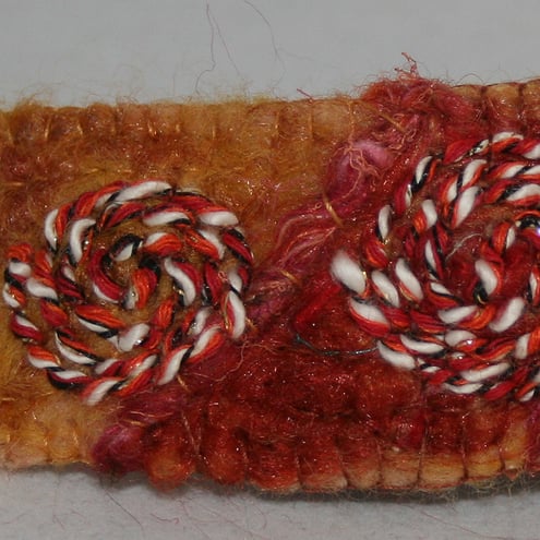 Merino, and other wools, combined with mohair and silk fibres, have been needle felted to create the background for this barrette. Several layers of differing and contrastting shades, have been built up on a base of a pure wool suiting, giving a depth of colour to the design. A diagonal division marked by couching over a hand dyed silk and wool yarn marks the boundary between an areas of gold and one dominated by reds. The pinwheel motif has been couched over a slubbed yarn.